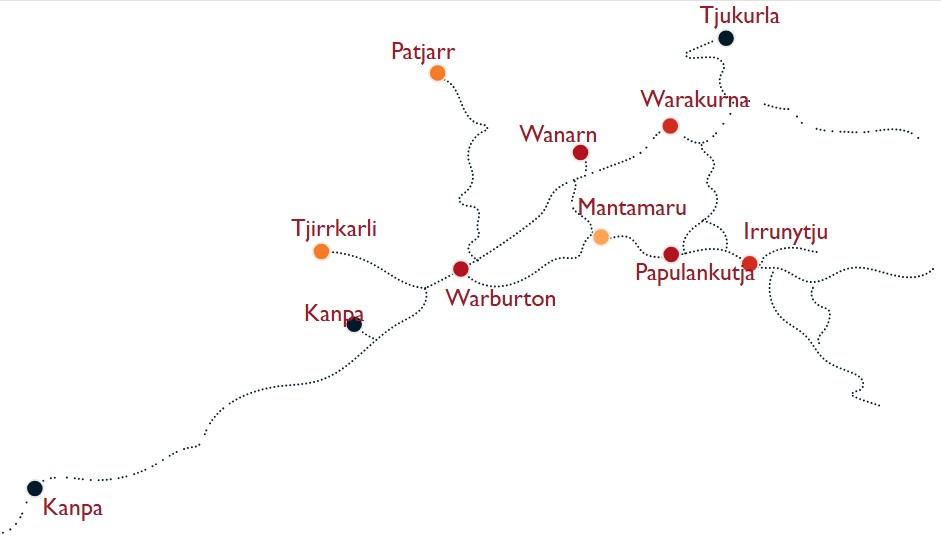 Blackstone, Jameson, Tjirrkarli, Tjukurla, Wanarn, Warburton, Warakurna, Wingellina